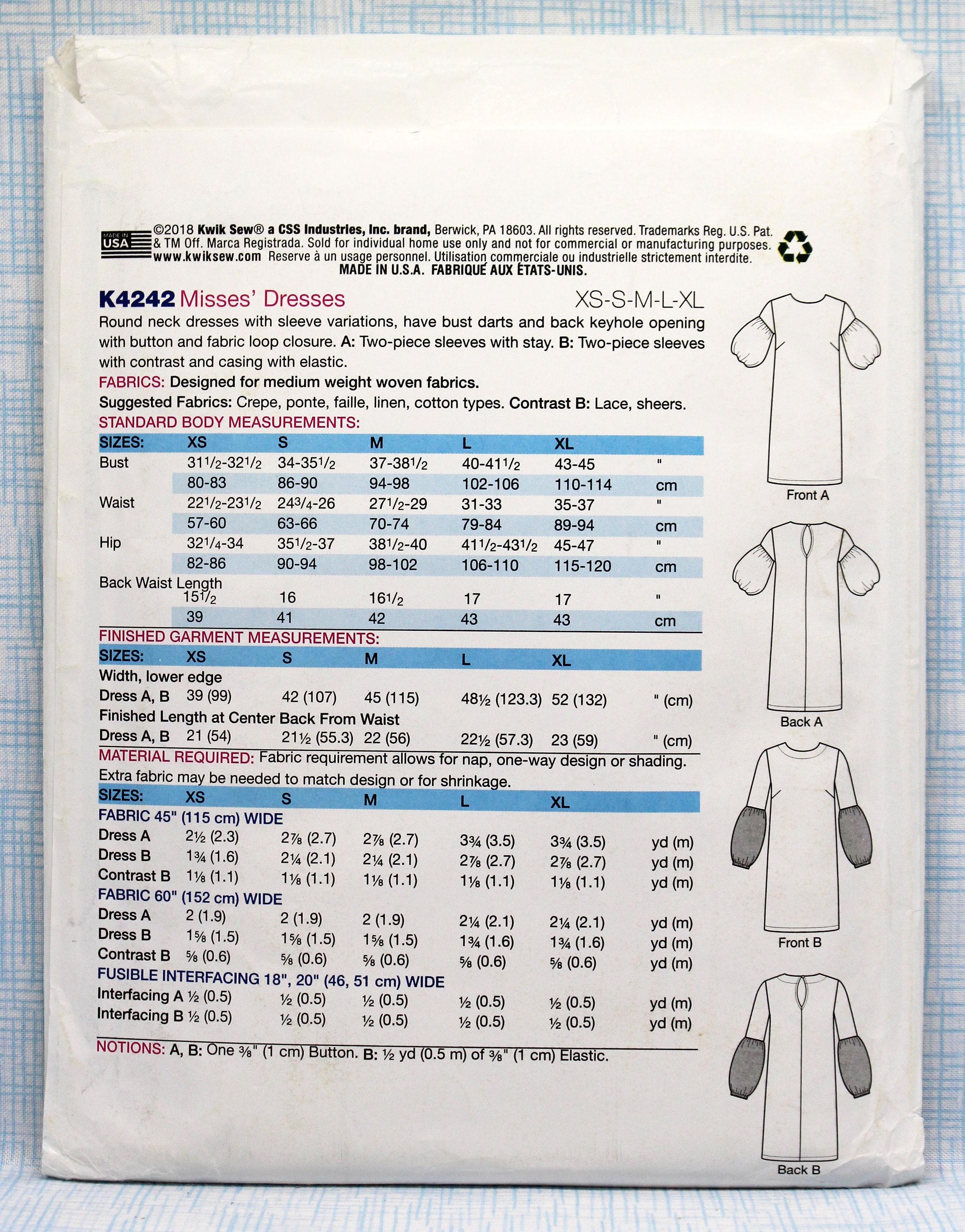 Kwik Sew 4242 Misses Straight Dresses With Sleeve Etsy